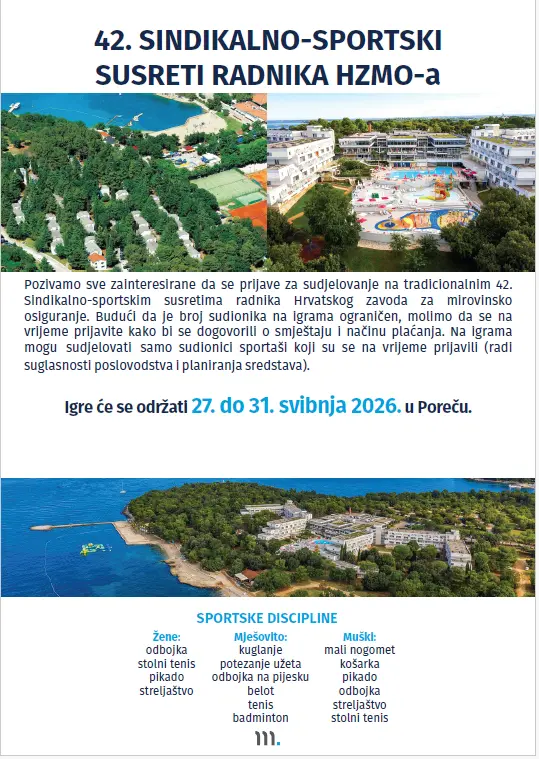 U petak, 20.02.2026. godine u Središnjoj službi održat će se sastanak Središnjeg i Organizacijskog odbora 42. sindikalno-sportskih igara u Poreču. Na sastanku će biti prisutni sindikalni povjerenici iz svih područnih službi i ureda, kao glavne i odgovorne osobe za prijave i organizaciju u svojim sredinama.