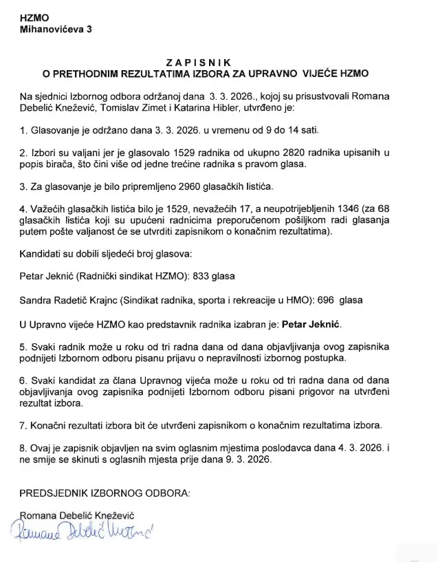 Dana 03. ožujka 2026. godine održani su izbori za predstavnika radnika u Upravno vijeće HZMO. Naš predsjednik, gosp. Petar Jeknić, ponovno je dobio podršku radnika Zavoda i izabran je u Upravno vijeće HZMO drugi put zaredom. Izborni odbor objavio je prethodne rezultate izbora i gosp. Petar Jeknić dobio je 833 glasa, a gđa. Sandra Radetič Krajnc 696 glasova.