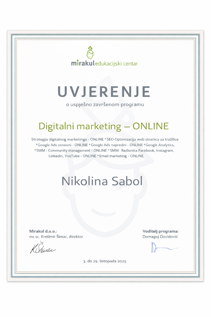 Gđa. Nikolina Sabol, asistentica za digitalizaciju i digitalni marketing na projektu DIGISIND, uspješno je završila online edukacijski program "Digitalni marketing - ONLINE" u organizaciji Mirakul edukacijskog centra, u razdoblju od 3. do 29. listopada 2025. godine.