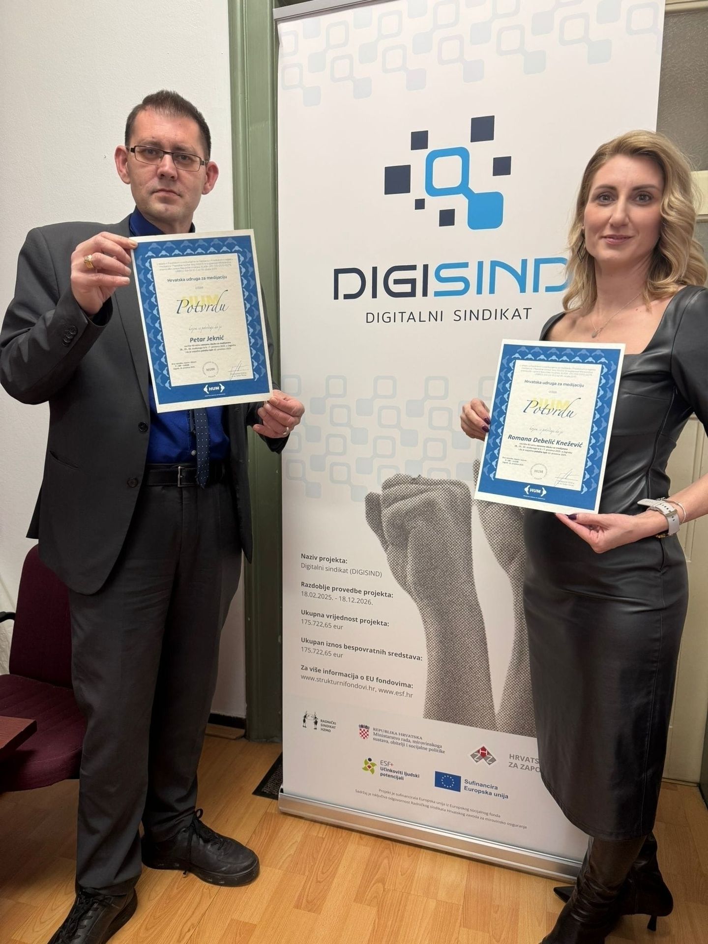 Potpisivanjem i svečanim uručenjem ugovora o dodjelu bespovratnih sredstava iz Europskog socijalnog fonda plus (ESF+) ostvarili smo važan cilj i službeno započeli provedbu EU projekta DIGISIND - Digitalni sindikat.